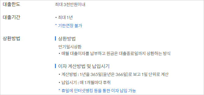이자 계산방법은 1년을 365일(윤년은 366일)로 보고 1일 단위로 계산하며 납입시기는 매 1개월마다 후취라고 합니다. 휴일에 인터넷 뱅킹 등을 통한 이자 납입도 가능하다고 합니다.