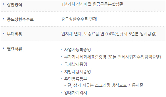 중도상환수수료 및 인지세는 면제지만 보증료율은 신규시 5년분 일시납 연 0.4%라고 하구요. IBK기업은행 희망플러스 보증부대출은 지역신용보증재단 신용보증서를 통한 신용보증서 담보대출이라고 합니다.