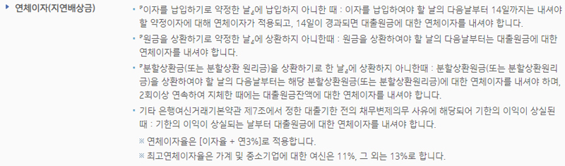 이자를 납입하기로 약정한 날에 납입하지 아니한 때 및 원금을 상환하기로 약정한 날에 상환하지 아니한때, 분할상환금(또는 분할상환 원리금)을 상환하기로 한 날에 상환하지 아니한때, 기타 은행여신거래기본약관 제7조에서 정한 대출기한 전의 채무변제의무 사유에 해당되어 기한의 이익이 상실된 때에는 연체이자를 내야 하는데요. 연체이자율은 이자율 + 연3%가 적용되며 최고연체이자율은 가계 및 중소기업에 대한 여신은 11%, 그 외는 13%라고 합니다.