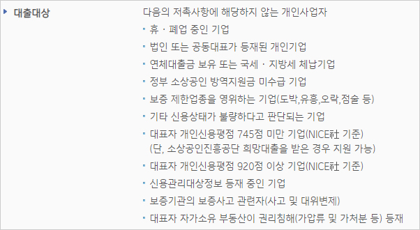 다만, ① 휴업 및 폐업 중인 기업, ② 법인 또는 공동대표가 등재된 개인기업, ③ 연체대출금 보유 또는 국세 및 지방세 체납기업, ④정부 소상공인 방역지원금 미수급기업 ⑤ 보증 제한업종을 영위하는 기업(도박, 유흥, 오락, 점술 등) ⑥ 기타 신용상태가 불량하다고 판단되는 기업 ⑦대표자 개인신용평점 745점 미만 기업(NICE社 기준) 다만 소상공인진흥공단 희망대출을 받은 경우에는 지원이 가능하다고 합니다.