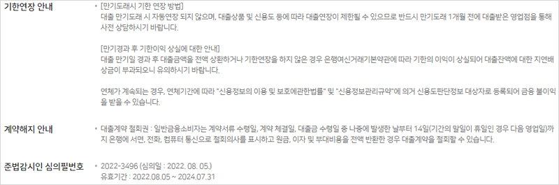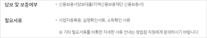 중도상환해약금은 없지만 사업자금 관련 신용보증기관 보증서 이용 시 보증료는 부담을 해야 하구요. 계약사항은 은행여신거래기본약관(기업용) 및 여신거래약정서 내용에 따르며, 추가계약사항이 있는 경우에는 추가거래약정서 또는 여신거래약정서 내 특약사항 작성을 통해 계약하면 된다고 합니다. 여신가능여부 및 여신거래조건 등은 영업점 상담후 최종 결정된다고 하네요.