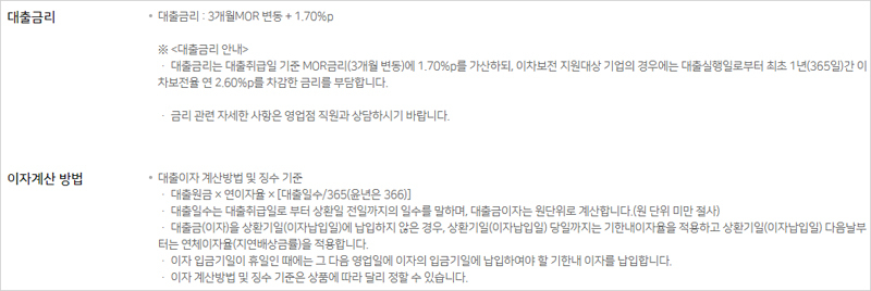 NH농협 희망플러스 특례보증 대출 금리는 3개월MOR 변동 + 1.70%p가 적용되는데요. 대출금리는 대출취급일 기준 MOR금리(3개월 변동)에 1.70%p를 가산하되, 이차보전 지원대상 기업의 경우에는 대출실행일로부터 최초 1년(365일)간 이차보전율 연 2.60%p를 차감한 금리를 부담하면 된다고 합니다. 보다 자세한 금리는 영업점 상담을 통해 확인할 수 있다고 해요.