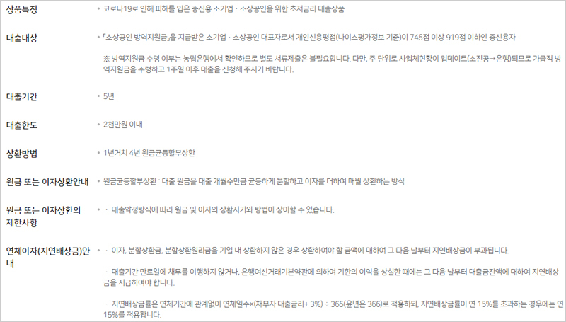 농협 희망플러스 특례보증 대출은 코로나19로 인해 피해를 입은 중신용 소기업 및 소상공인을 위한 초저금리 대출상품이라고 합니다. 농협 희망플러스 특례보증 대출 대상은 소상공인 방역지원금 또는 손실보전금을 지급받은 소기업 및 소상공인 대표자로서 개인신용평점(나이스평가정보 기준)이 745점 이상 919점 이하인인 중신용자 분들이라고 합니다.