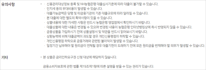 NH농협 희망플러스 특례보증 대출은 신용관리대상정보 등록 및 NH농협은행 대출심사기준에 따라 대출이 불가할 수 있구요. 인지세 등의 부대비용이 발생할 수 있으며 대출가능금액은 당행 및 타금융기관의 기존 대출규모에 따라 달라질 수 있다고 합니다. 또한 대출에 대한 별도의 특약사항이 있을 수도 있다고 해요. 특히 일정기간 납부해야 할 원리금이 연체될 경우에는 대출기한이 도래하기 전에 모든 원리금을 변제해야 할 의무가 발생할 수 있다고 하네요.