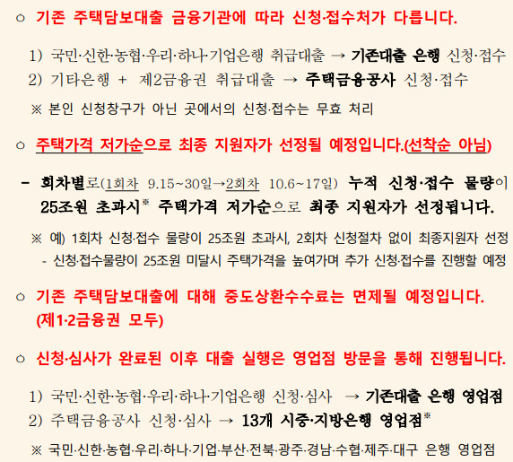 만약 회차별로 누적 신청 및 접수 물량이 25조원을 넘어설 경우 주택 가격 저가 순으로 최종 지원자가 선정된다고 하는데요. 예를 들어 1회차(9월 15일∼30일) 신청 및 접수 물량이 25조원을 초과하면 2회차(10월 6일∼17일) 신청 절차 없이 최종 지원자를 선정하게 되는 방식이라고 해요.