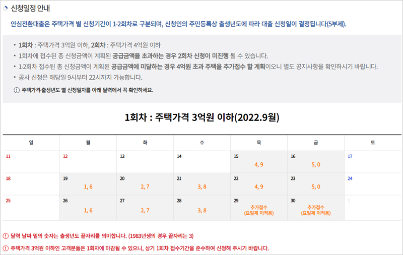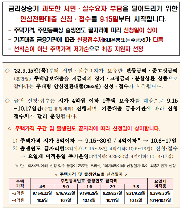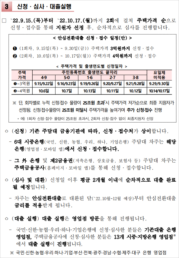 우대형 안심전환대출 신청방법 및 기간은 주택가격에 따라 다른데요. 1회차(9월 15일∼30일)에는 주택가격 3억원까지 신청할 수 있구요. 2회차(10월 6일∼17일)에는 주택가격 4억원까지 신청할 수 있다고 해요.