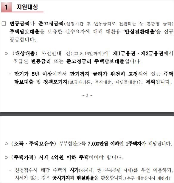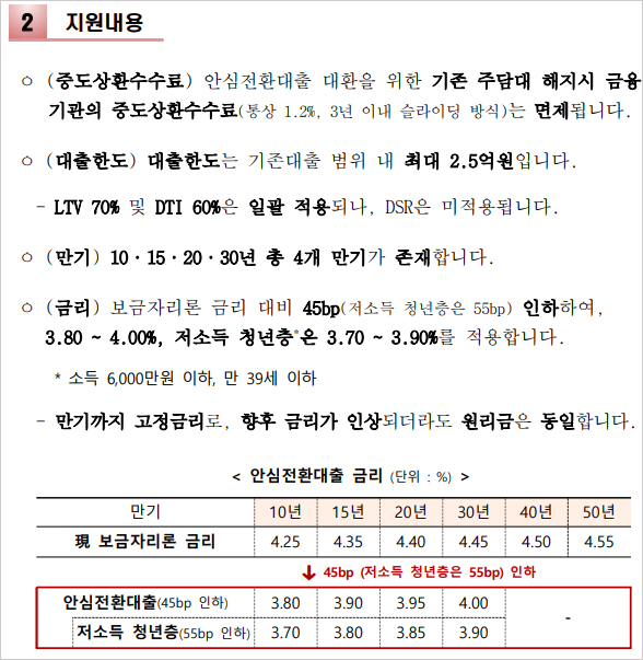 우대형 안심전환대출 자격 조건 소득은 부부합산소득 7천만원 이하, 주택 가격(시세 기준) 4억원 이하인 1주택자라면 신청할 수 있구요. 기존 대출 잔액 범위 내에서 최대 2억5천만원까지 대출받을 수 있다고 합니다. 참고로 소득이 7천만 원을 넘는 대출자는 내년에 시행 예정인 '일반형' 안심전환대출을 이용할 수 있다고 합니다.