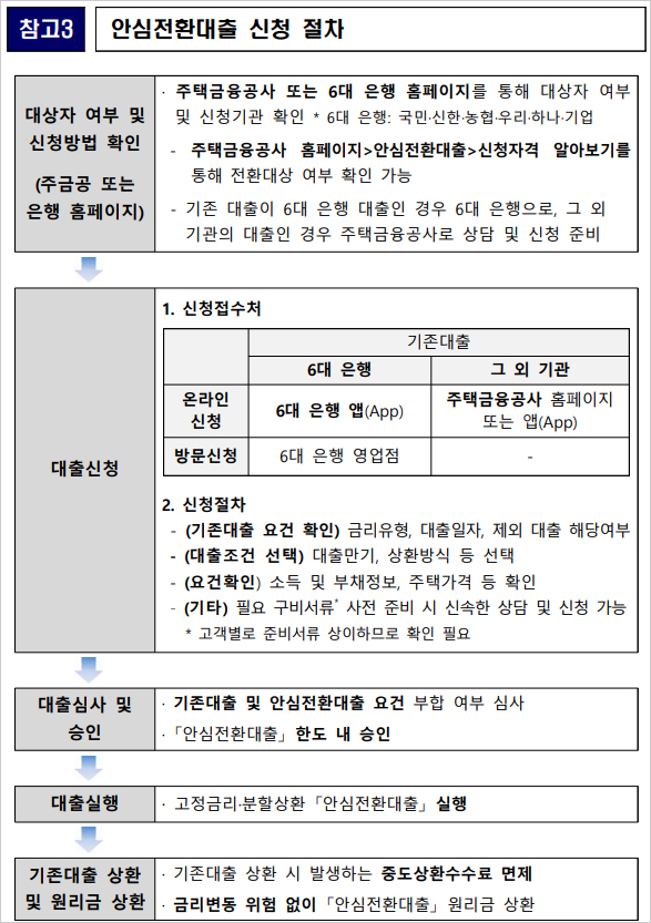 우대형 안심전환대출 신청방법은 기존 주담대 취급기관에 따라 다르다고 하는데요. 6대 은행의 주담대는 기존 대출 은행의 온라인 페이지나 영업점 창구에서 신청을 받구요. 그 외 은행이나 제2금융권 주담대는 주금공 홈페이지나 앱에서 신청하면 된다고 해요.