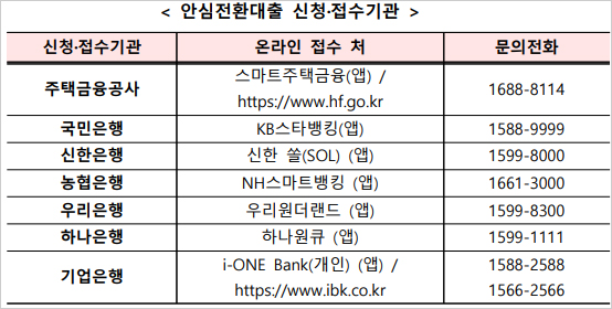 안심전환대출 신청은 국민은행, 신한은행, 농협은행, 우리은행, 하나은행, 기업은행 등 6대 은행과 주금공을 통해 9월 15일부터 안심전환대출 신청이 가능하다고 합니다.