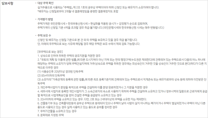대상 주택은 실거주용으로 사용되는 주택법 제 2조 1호의 공부상 주택이어야 합니다. 신청인 또는 배우자가 소유자여야 합니다. 배우자는 신청일로부터 3개월 내 결혼예정임을 증명한 결혼예정자도 포함된다고 합니다.