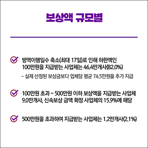 보상금 사전산정을 위해 지역 및 시설 평균값을 적극 활용하는 등 보상금 산식을 간소화한 결과, 신속보상 규모가 약 90% 수준으로 늘었다고 합니다. 신속보상 대상 업체 수는 식당 및 카페가 45만9000개사(81.1%, 5800억원)로 가장 많았다고 합니다. 실내체육시설 4만3000개사(7.6%), 유흥시설 2만7000개사(4.8%) 순이였다고 합니다.