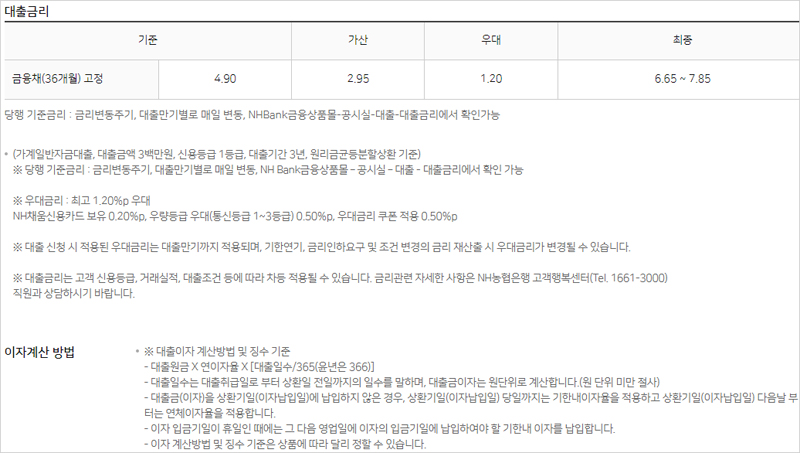 ※ 대출금리는 고객 신용등급, 거래실적, 대출조건 등에 따라 차등 적용될 수 있다고 합니다. 금리관련 자세한 사항은 NH농협은행 고객행복센터(Tel. 1661-3000) 직원과 상담하면 된다고 합니다.