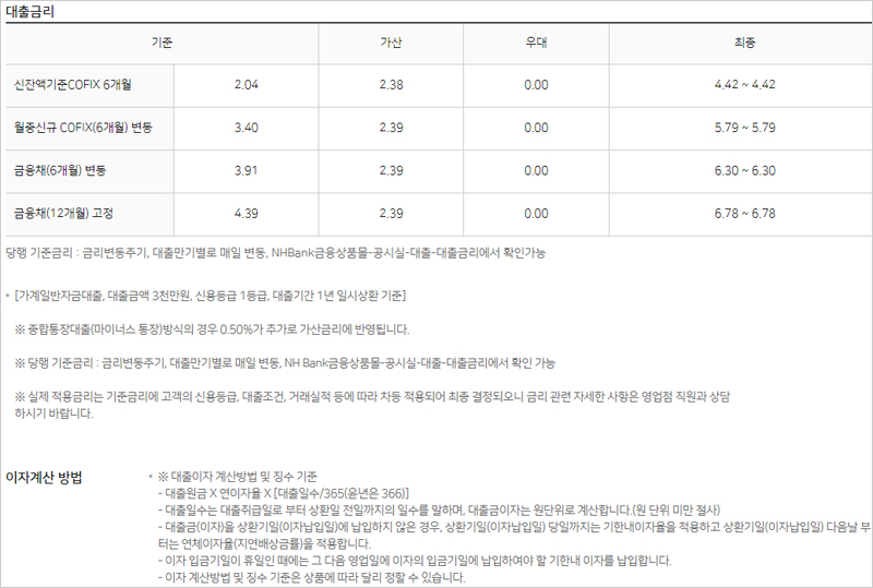 ※ 당행 기준금리 : 금리변동주기, 대출만기별로 매일 변동, NH Bank금융상품몰-공시실-대출-대출금리에서 확인이 가능하다고 합니다.