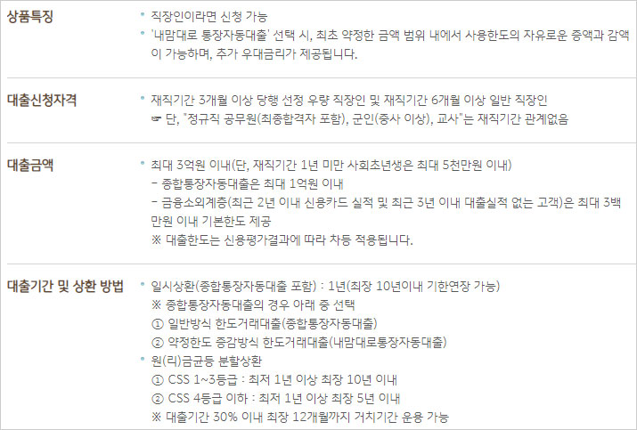 ※ 약정한도 증감방식 한도거래대출(내맘대로 통장자동대출) 선택시 '내맘대로 우대금리(연 0.1%p)'가 추가 적용됩니다.(CSS 1~4등급)