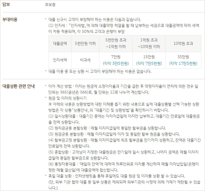 (1) 인지세 : 「인지세법」에 의해 대출약정 체결을 할 때 납부하는 세금으로 대출금액에 따라 세액이 차등 적용되며, 각 50%씩 고객과 은행이 부담합니다.