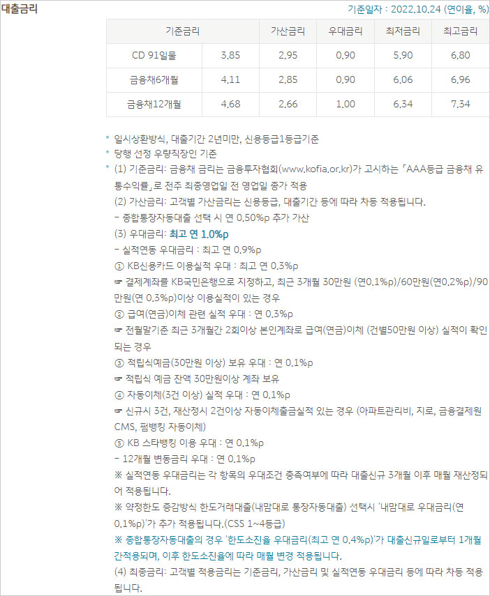 (2) 가산금리: 고객별 가산금리는 신용등급, 대출기간 등에 따라 차등 적용된다고 합니다.
