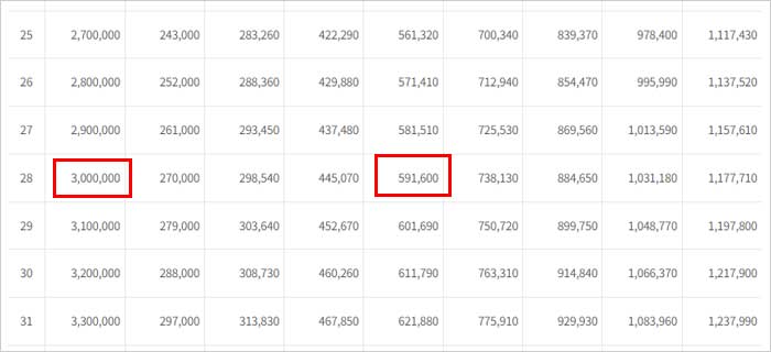 2. 만약 300만원의 소득에 270,000의 보험료를 20년 동안 낸다고 가정 했을 때 2023년도 기준 예상연금월액표에서는 매월 591,600원의 연금을 지급 받는 것으로 나오네요.