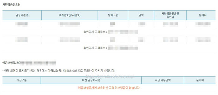 또한 예금보험공사에는 없지만 서민금융진흥원에는 2건의 휴면계좌가 있는 것으로 나왔는데요. 이 또한 기억에 없는 계좌로 아주 적은 금액이 있는 것으로 확인이 되고 있네요. 다만 휴면계좌 통합조회 시스템-전국은행연합회 서비스 조회 금액과 실수령액은 이자소득세 등 세금부과에 따라 다소 차이가 있을 수 있을 수 있다고 해요.