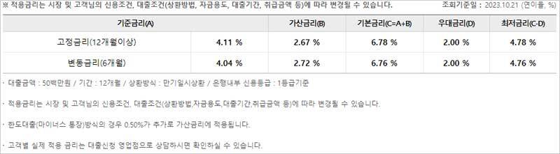 다만 적용금리는 시장 및 신용조건, 대출조건(상환방법,자금용도,대출기간,취급금액 등)에 따라 변경될 수 있으며 한도대출(마이너스 통장)방식의 경우 0.50%가 추가로 가산금리에 적용된다고 합니다. 고객별 실제 적용 금리는 대출신청 영업점으로 상담하시면 확인하실 수 있다고 합니다.