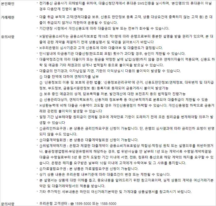 - 일반금융소비자는 금융소비자보호법 제19조 제1항에 따라 은행으로부터 충분한 설명을 받을 권리가 있으며, 대출에 관한 계약을 체결하기 전에 상품설명서 및 약관을 읽어보시기 바랍니다.