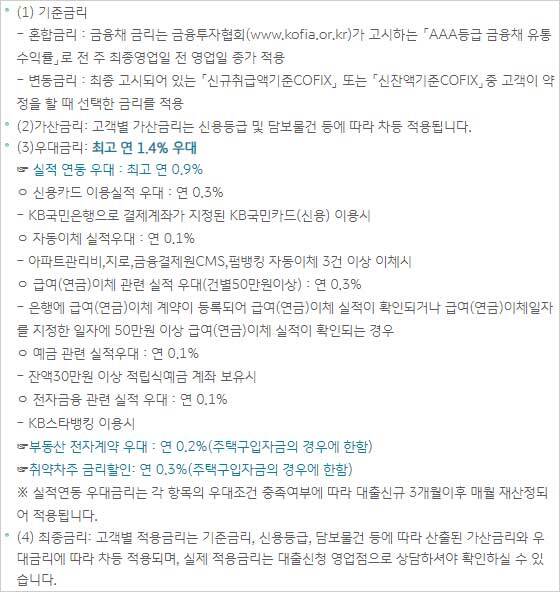 참고로 실적연동 우대금리는 각 항목의 우대조건 충족여부에 따라 대출신규 3개월 이후 매월 재산정되어 적용된다고 합니다. 이에 따라 KB국민은행 주택담보대출 최종 적용 금리는 기준금리, 신용등급, 담보물건 등에 따라 산출된 가산금리와 우대금리에 따라 차등 적용되면, 실제 적용금리는 대출신청 영업점에서 상담을 통해 확인할 수 있다고 합니다.