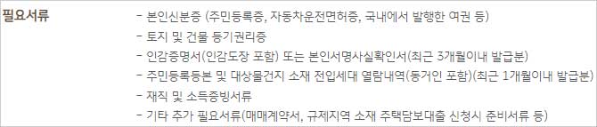 - 기타 추가 필요서류(매매계약서, 규제지역 소재 주택담보대출 신청시 준비서류 등) 등이라고 합니다.