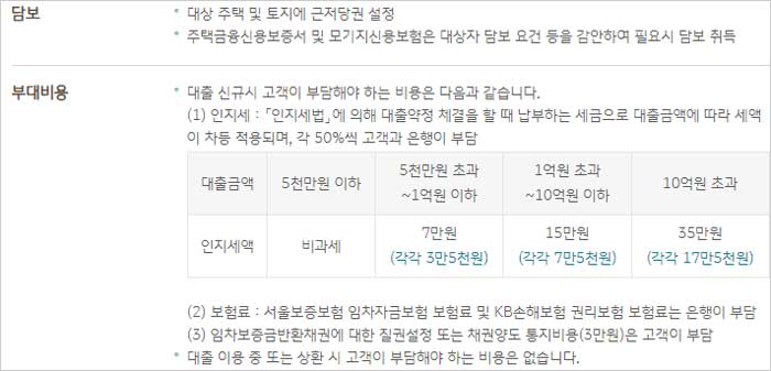 대상 주택 및 토지에 근저당권 설정, 주택금융신용보증서 및 모기지신용보험은 대상자 담보 요건 등을 감안하여 필요시 담보를 취득하며 대출 신규시 고객이 부담해야 하는 비용, 인지세는 다음과 같다고 합니다.