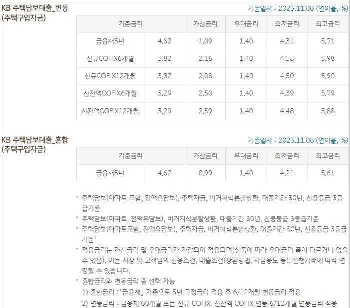 ▶ KB국민은행 주택담보대출 이율 이자 금리는 다음과 같은데요. 2023년 11월 8일 기준