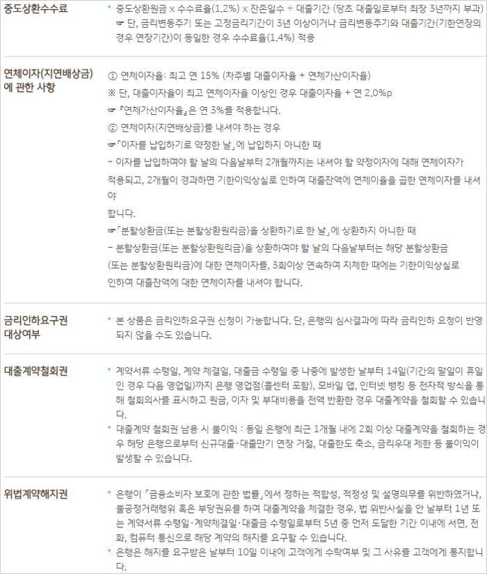 3. 혼합상환(일시상환+분할상환) : 최저 1년 이상 최장 20년 이내라고 합니다. 다만 위의 1~3 에도 불구하고 최저 대출기간은 금리변동주기 이상, 혼합금리대출은 10년 이상으로 운용된다고 해요.