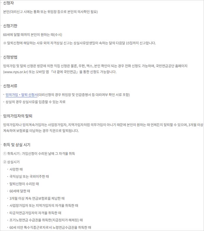- 임의가입 및 탈퇴 신청은 방문에 의한 직접 신청은 물론, 우편, 팩스, 본인 확인이 되는 경우 전화 신청도 가능하며, 국민연금공단 홈페이지(http://www.nps.or.kr) 또는 모바일 앱 내 곁에 국민연금을 통한 신청도 가능하다고 합니다.