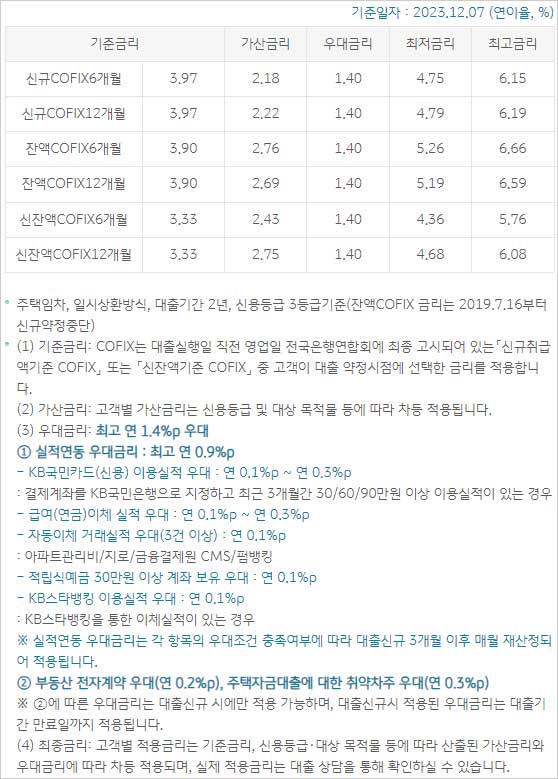 2023년 12월 07일 기준 주택임차, 일시상환방식, 대출기간 2년, 신용등급 3등급기준(잔액COFIX 금리는 2019.7.16부터 신규약정중단)이라고 합니다.