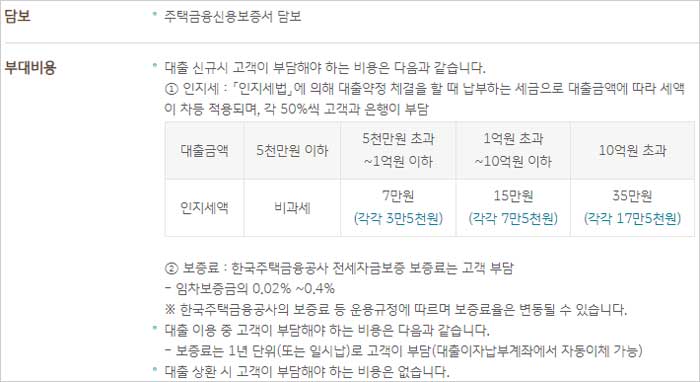 주택금융신용보증서 담보가 필요하며 대출 신규시 고객이 부담해야 하는 비용, 인지세는 다음과 같다고 합니다.