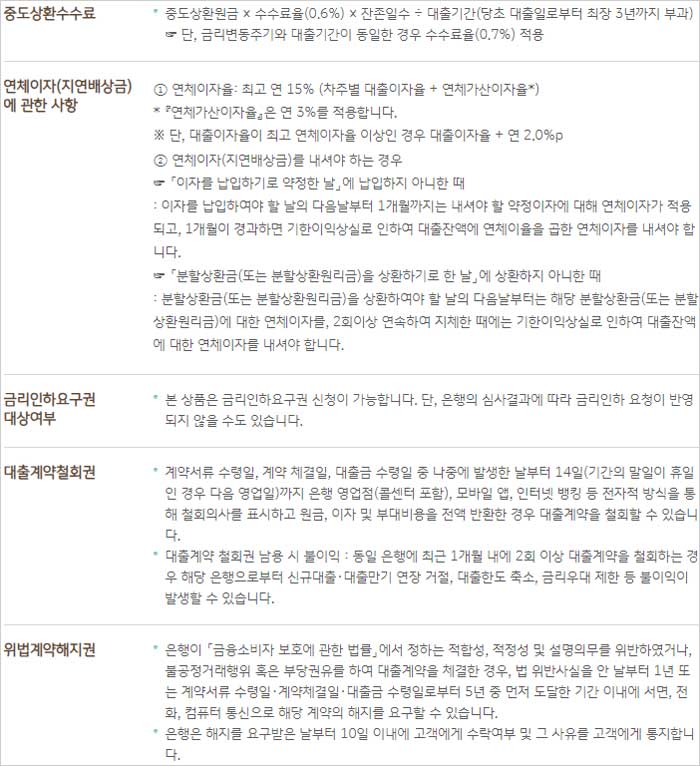 - 금리재산정주기가 도래하거나 대출금을 기한연장하는 경우에는 기준금리 변동, 우대금리 제공조건 충족여부, 신용등급 변화 등에 따라 금리가 하락 또는 상승될 수 있다고 합니다.