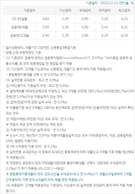 KB국민은행 직장인든든 신용대출 금리는 다음과 같다고 하는데요. 일시상환방식, 대출기간 2년 미만, 신용등급 3등급 기준에 대한 금리라고 합니다.
