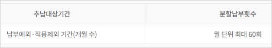 ▶ 추납보험료는 전액을 일시에 납부하거나 금액이 클 경우 월 단위 최대 60회 분할하여 납부할 수 있다고 합니다. 단, 추납보험료를 분할하여 납부하고자 할 때에는 정기예금 이자를 가산하여 납부해야 합니다.