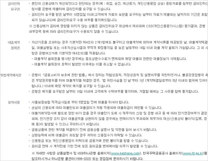 상환능력에 비해 대출금이 과도할 경우 신용점수가 하락할 수 있으며 신용등급 또는 개인신용평점의 하락으로 금융거래 관련 불이익을 받을 수 있다고 하구요. 원리금 연체 시 계약만료 기한 전에 모든 원리금을 변제해야할 의무가 발생될 수 있다고 해요. 참고로 하나은행 사잇돌 중금리대출 상품은 금리인하 요구권 및 대출계약 철회권, 위법계약 해지권 신청이 가능하다고 합니다.