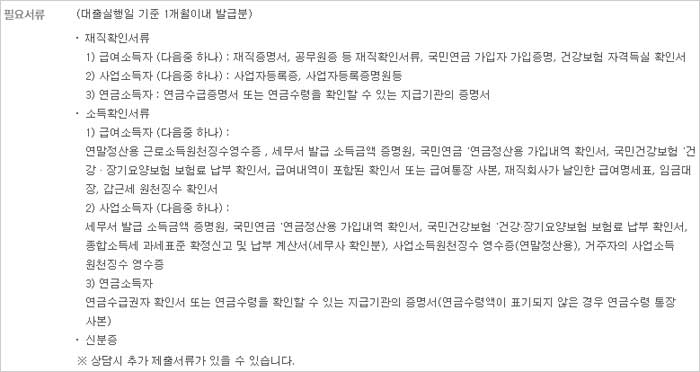 1) 급여소득자 (다음중 하나) : 재직증명서, 공무원증 등 재직확인서류, 국민연금 가입자 가입증명, 건강보험 자격득실 확인서