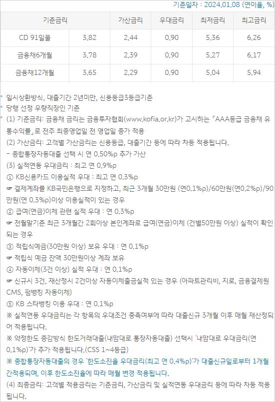 KB직장인든든 국민은행 신용대출 금리는 다음과 같다고 하는데요. 기준일자 2024년 01월 08일, 일시상환방식, 대출기간 2년 미만, 신용등급 3등급 기준에 대한 금리라고 해요.