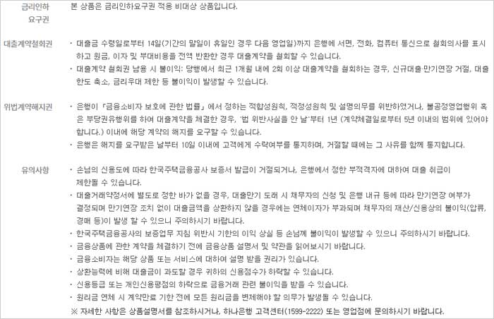 - 보다 자세한 사항은 상품설명서를 참조하거나, 하나은행 고객센터(1599-2222) 또는 각 영업점을 통해 문의할 수 있다고 합니다. 참고하셨으면 좋겠어요.