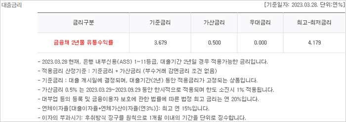 기준금리는 대출 개시일에 결정되며, 대출기간(2년) 동안 적용금리가 고정되는 상품이라고 합니다. 가산금리 0.5%는 2023.03.29~2023.09.29 동안 한시적으로 적용되며 한도 소진시 1%가 적용된다고 합니다. 참고로 연체이자율[대출이자율+연체가산이자율(연3%)]은 최고 연 15%이며 이자의 부과시기는 후취방식 징구를 원칙으로 1개월 이내의 기간을 단위로 징수한다고 합니다.