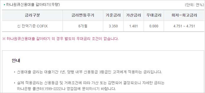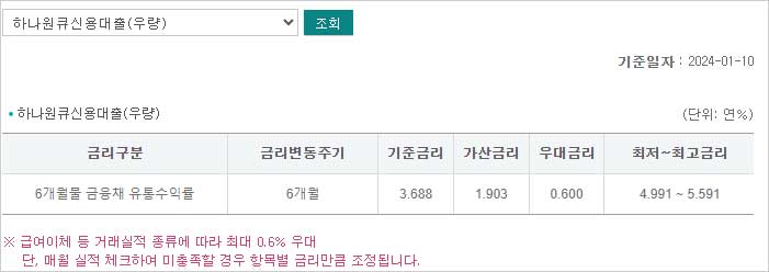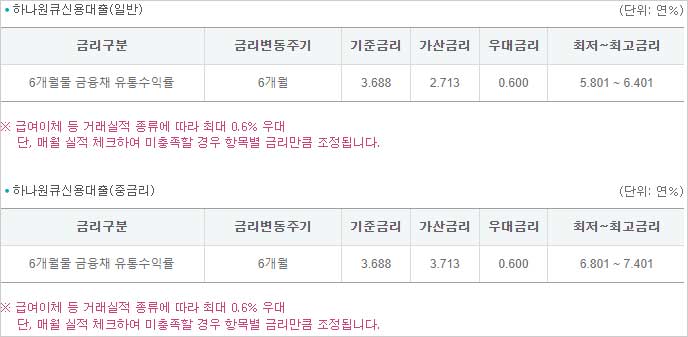하나은행 직장인 신용대출 금리는 아래와 같은데요. 대출기간 1년, 하나은행 내부 신용등급 3등급인 고객에게 적용하는 금리라고 합니다. 다만 실제 적용금리는 신용등급 및 거래조건에 따라 가산 또는 감면되어 결정되 때문에 자세한 금리는 하나은행 콜센터(1599-2222)나 영업점에 문의하면 된다고 해요.