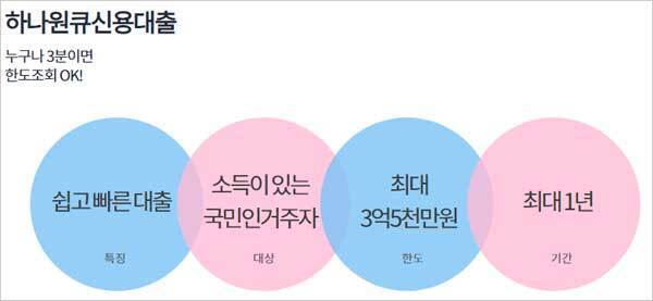 3. 하나원큐 신용대출 갈아타기(타행대환): 타행대출 보유하여 대환 요구가 있는 분이라고 하는데요. 대출 한도 금액은 최대 3억 5천만원까지 가능하다고 해요. 다만 최저 50만원부터 10만원 단위로 신청 가능하다고 하네요.
