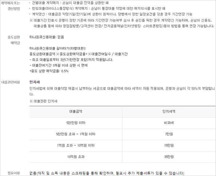 건별대출 계약해지는 고객이 대출금 전액을 상환한 때이며 한도대출(마이너스통장방식) 계약해지는 고객이 통장대출 약정에 대한 해지의사를 표시한 때라고 합니다. 계약갱신에 대해 알아보면 대출금은 약정기일(만기일)에 상환이 원칙이지만 하나은행에서 정한 일정요건을 갖춘 경우 기한 하나은행 직장인 신용대출 연장이 가능하다고 해요.