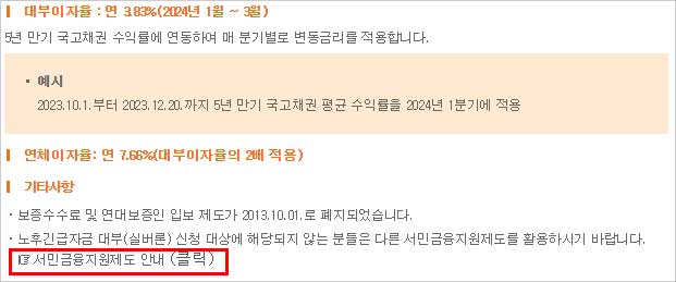 2023.10.1.부터 2023.12.20.까지 5년 만기 국고채권 평균 수익률을 2024년 1분기에 적용한다고 합니다. 참고로 연체 이자율은 연 7.66%로 대부이자율의 2배가 적용된다고 합니다.