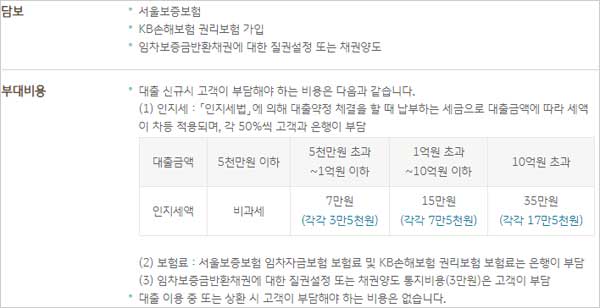 - 보험료 - 서울보증보험 임차자금보험 보험료 및 KB손해보험 권리보험 보험료는 은행이 부담합니다.