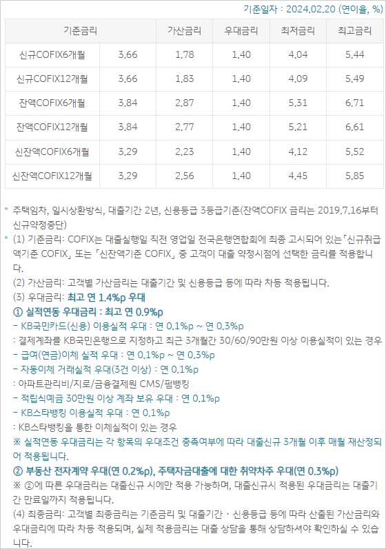 다음과 같은데요. 2024.02.20 현재, 주택임차, 일시상환방식,대출기간 2년, 신용등급 3등급인 고객에게 적용하는 금리라고 합니다.