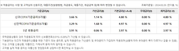 - 다음과 같은데요. 2024년 2월 26일 기준금리 및 변동금리에 대한 가산금리, 기준금리, 우대금리, 최저금리라고 합니다.