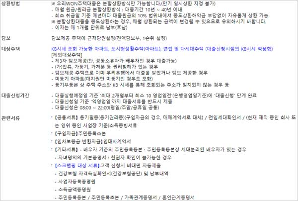 - 매월 원금/원리금 분할상환방식 : 대출기간 10년 ~ 40년 이내,