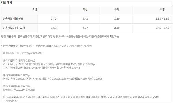 기준금리는 금리변동주기, 대출만기별로 매일 변동되며 NHBank금융상품몰-공시실-대출-대출금리에서 확인 가능한데요. 다만 실제 적용금리는 기준금리에 고객 신용등급, 대출조건, 거래실적 등에 따라 차등 적용되어 최종 결정되기 때문에 금리 관련 자세한 사항은 영업점 직원과 상담이 필요하다고 합니다.