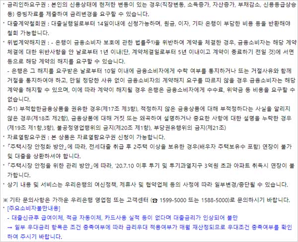 우리은행 전세금안심대출 상품은 금리인하 요구권 신청 및 대출계약 철회권, 위법계약 해지권, 자료열람요구권 신청이 가능하다고 합니다. 보다 자세한 상품정보 및 대출신청 문의는 영업점 직원 또는 우리은행 고객센터(1599-5000 또는 1588-5000)에 문의하거나 우리은행 홈페이지를 참조하면 된다고 합니다.